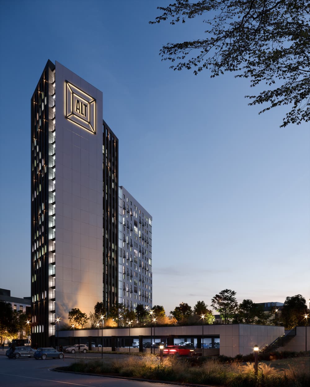 «ALT» представляет собой разноэтажный дом 19-23 этажей с двухуровневым паркингом. Во внутреннем дворе, образованном массивом здания, нет уличного шума и ветра. Переменная этажность дома делает двор и квартиры светлыми. Фасад здания выполнен в контрастных тонах.