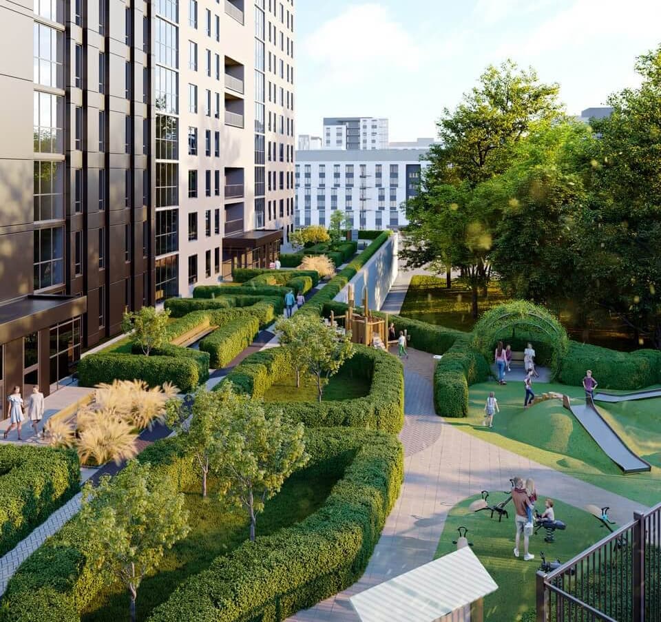 Общественные пространства и благоустройство расположены прямо над двухуровневой парковкой. Ландшафтный парк, прогулочные дорожки и зоны отдыха. В доме спроектированы помещения под магазины, кафе, аптеки и соседский центр.