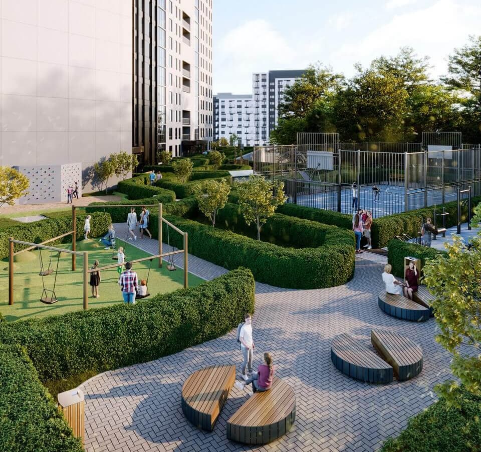 Планировочным решением двор разделён на две части: Прогулочную, которая будет расположена вдоль дома и зону для игр и занятий спортом. На детской площадке будут размещены зоны для игр малышей и детей постарше с безопасным покрытием. Так же на территории двора предусмотрена зона Воркаута. Будут выполнены ландшафтный дизайн и вечернее освещение.