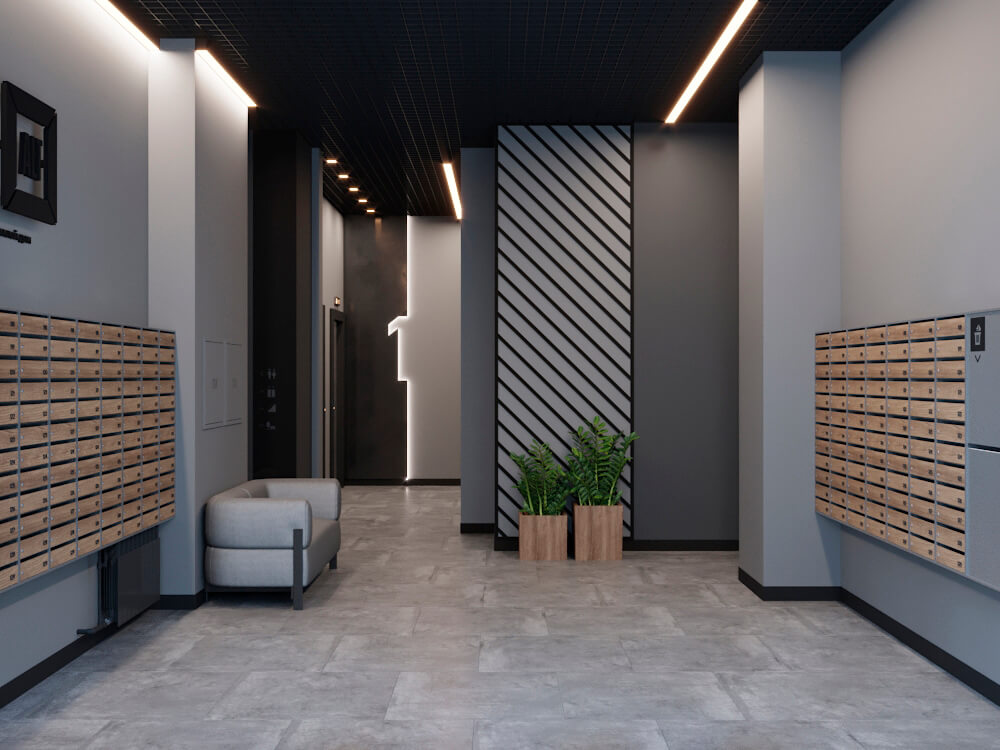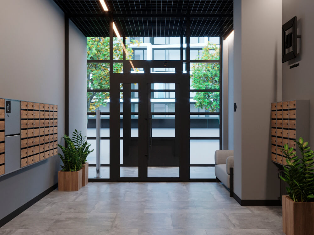 В домах прозрачные входные группы из стекла. Жители видят, что происходит внутри и снаружи подъезда. Интерьеры общих холлов выполнены в современном стиле с элементами модерна и поддерживают архитектурную идею.