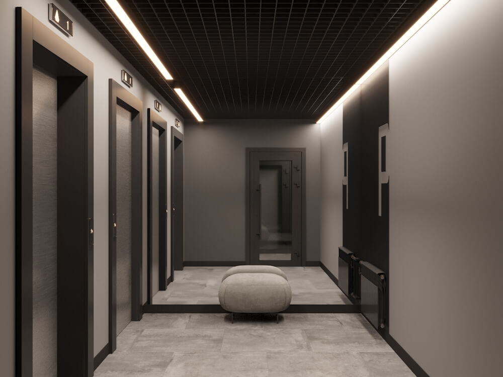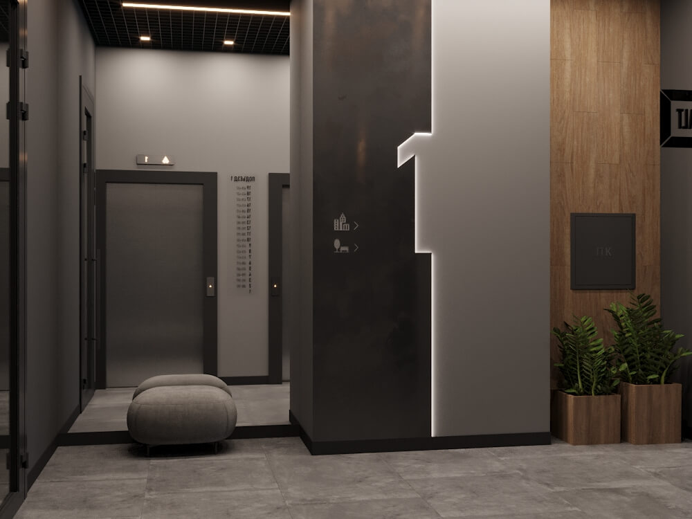 В вестибюле первого этажа организованы зоны отдыха и ожидания гостей, курьера или такси. Ориентироваться на этажах помогает простая и понятная навигация.