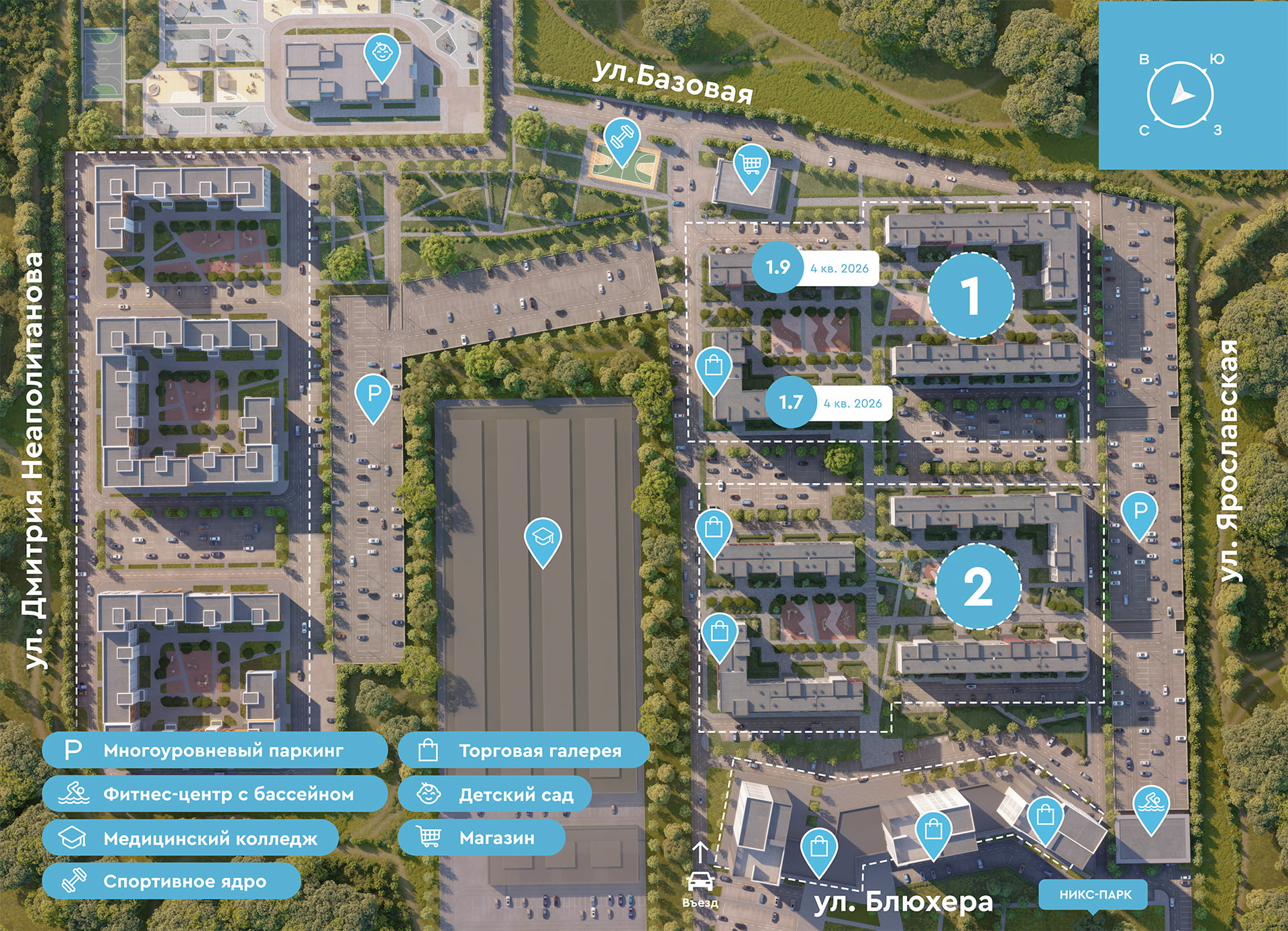 Жилой комплекс находится в районе с хорошо развитой инфраструктурой: в непосредственной близости расположены школы, детские сaды, остановка наземного транспорта и гипермаркет «Лента». На территории комплекса предусмотрены зоны для коммерческих помещений, где вскоре откроются кафе и магазины, а также будет построен продуктовый магазин для жителей НИКС Лайн на Ярославской.