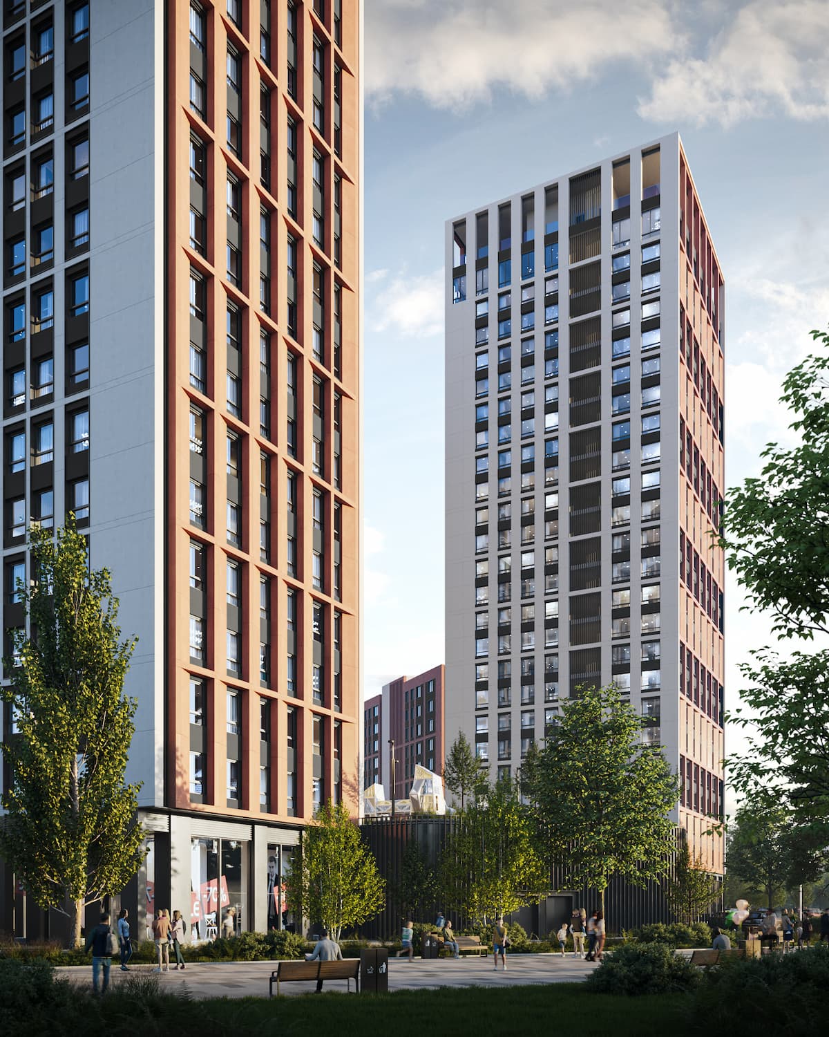 Современный жилой комплекс бизнес-класса, состоящий из 5 башен переменной этажности, объединенных единым паркингом, большим двор-парком с детской площадкой, зонами активного и спортивного отдыха.