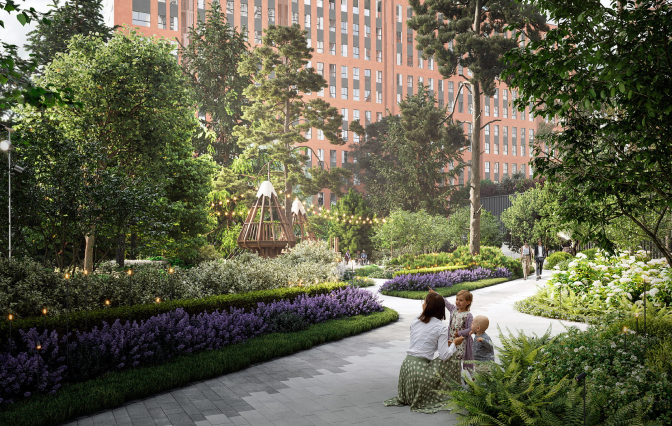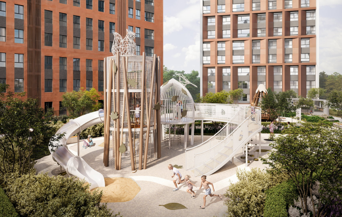 Большой дворовой парк с детскими площадками, зонами активного и спортивного отдыха, прогулочной аллеей и уютными зонами для спокойного отдыха.